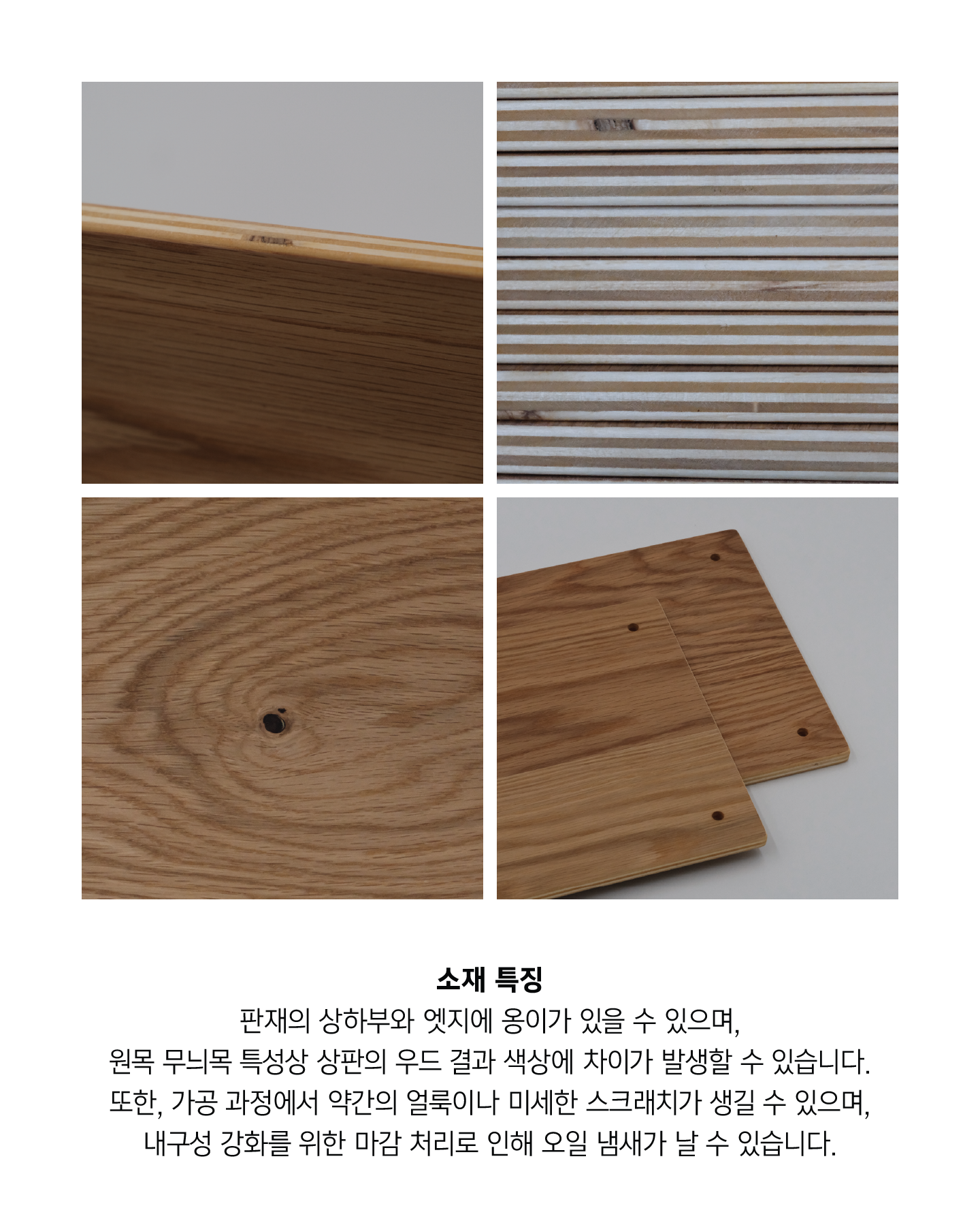 - 판재의 상하부와 엣지에 옹이가 있을 수 있으며, 원목 무늬목 특성 상 우드결과 색상 차이가 발생할 수 있습니다.